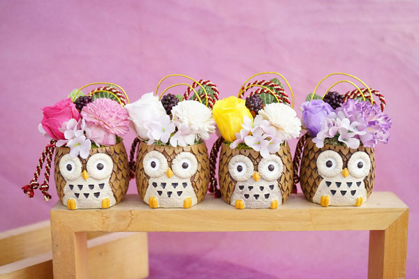 長寿のお祝いと感謝の気持ちを込めた手のひらサイズのアレンジです。「福が来る」「苦労がない」などを願った縁起物として愛されている可愛いふくろうの器にアレンジしました。