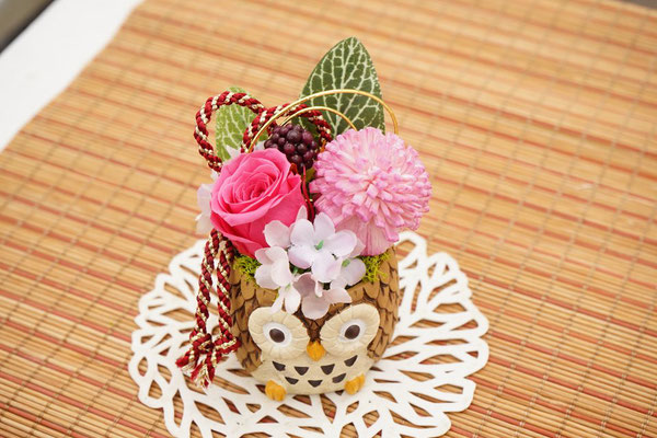 ・材質/プリザーブドフラワー(バラ、モス)、ソラフラワー、アートフラワー、水引、和紐、器(ふくろう)