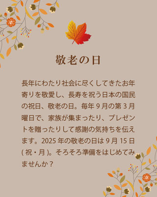 長年にわたり尽力されてきたお年寄りを敬愛し、長寿を祝う日本の国民の祝日、敬老の日✨
