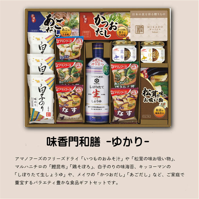 白子のりの味海苔、キッコーマンの「しぼりたて生しょうゆ」や、メイワの「かつおだし」「あごだし」など、ご家庭で重宝するバラエティ豊かな食品ギフトセットです✨